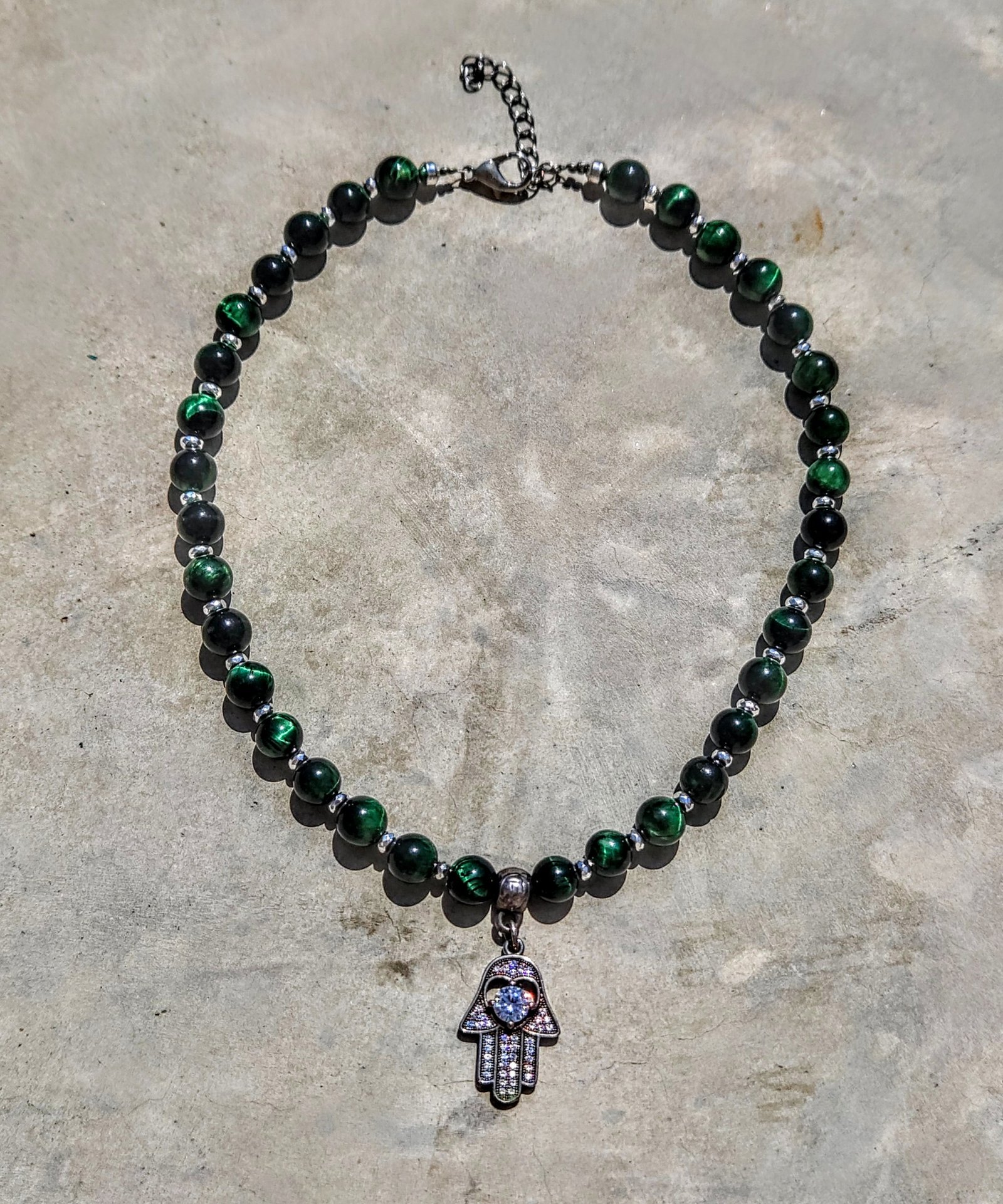 יוקרה אקזוטית (דגם 1). שרשרת אבני טייגר איי ירוק נדיר, עם תליון חמסה מנצנץ – הגנה עם ברק מסתורי.