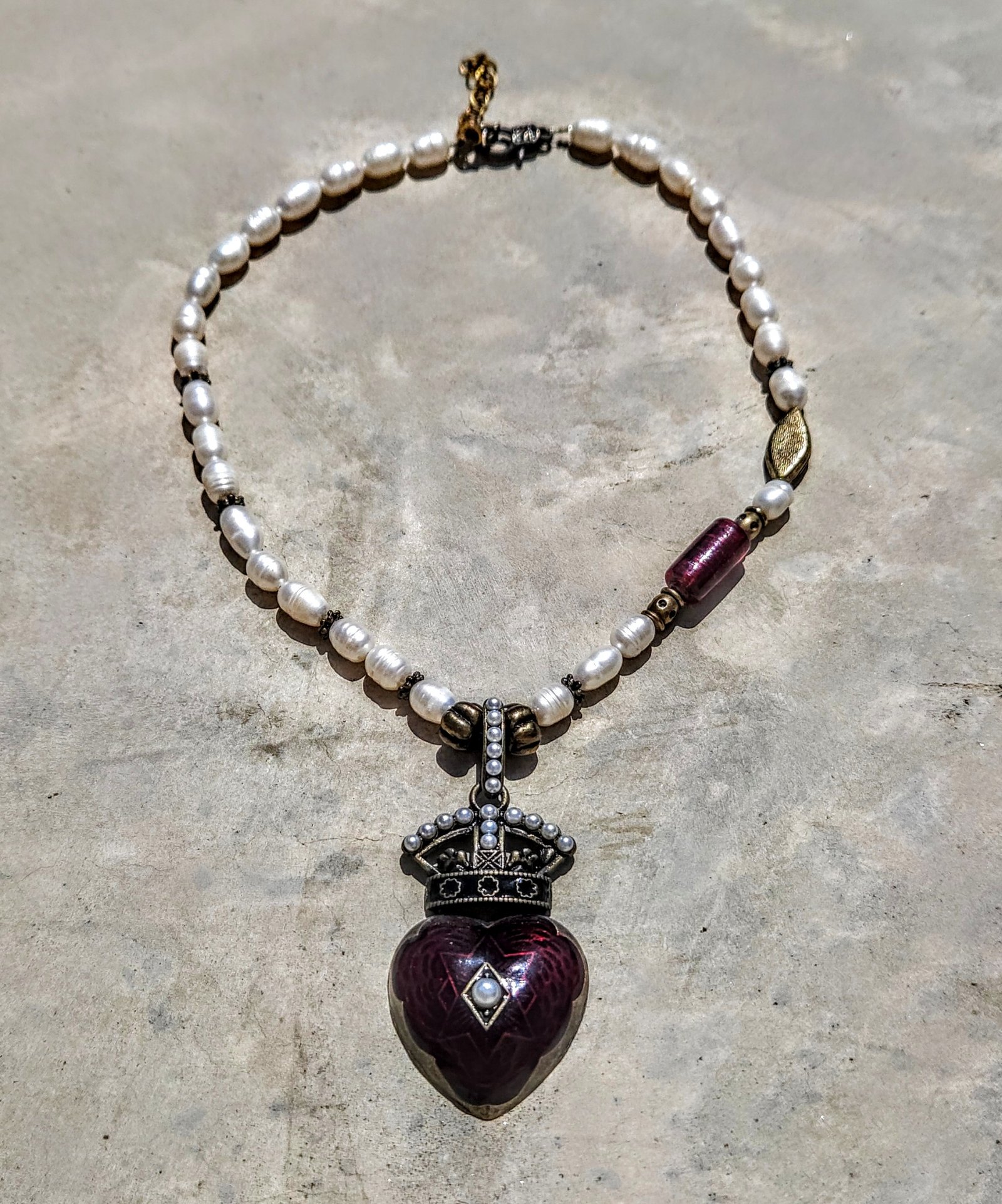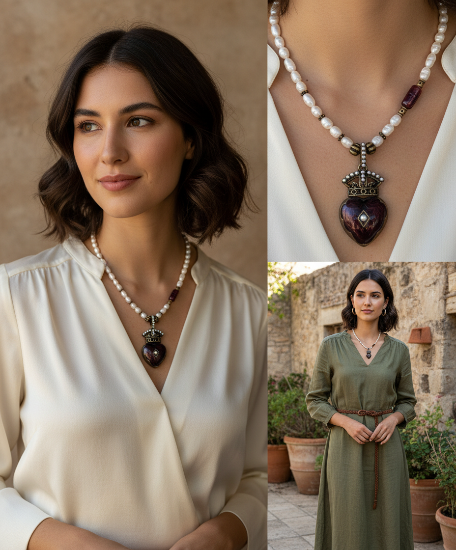 האהבה המלכותית. שרשרת פניני מים מתוקים טבעיות ותליון לב אדום עם כתר עתיק – לשאת את הלב בגאווה.