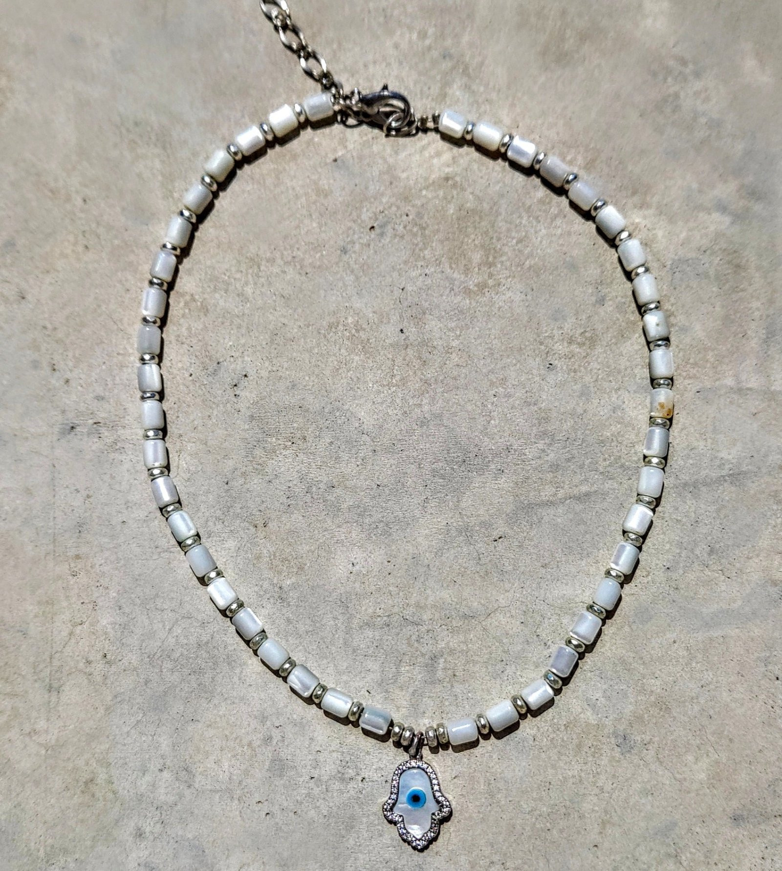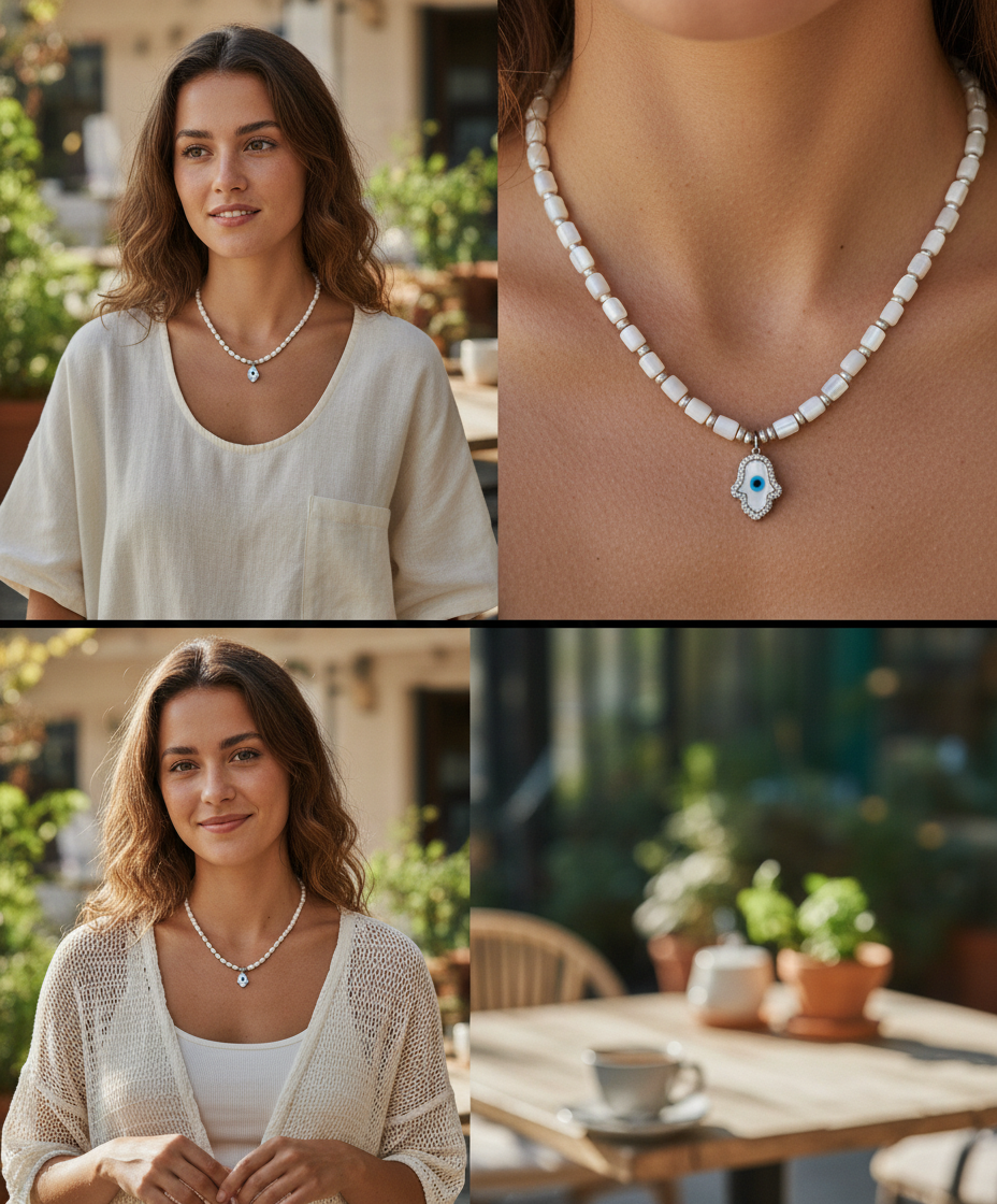 הזוהר הימי. קולר אם הפנינה טהורה עם תליון חמסה משובצת ועין רע – אלגנטיות לבנה והגנה כפולה.