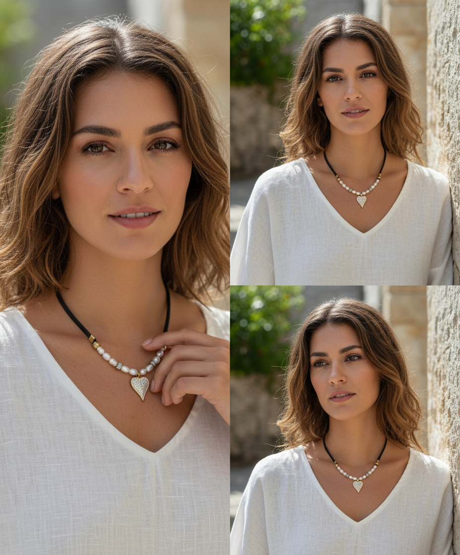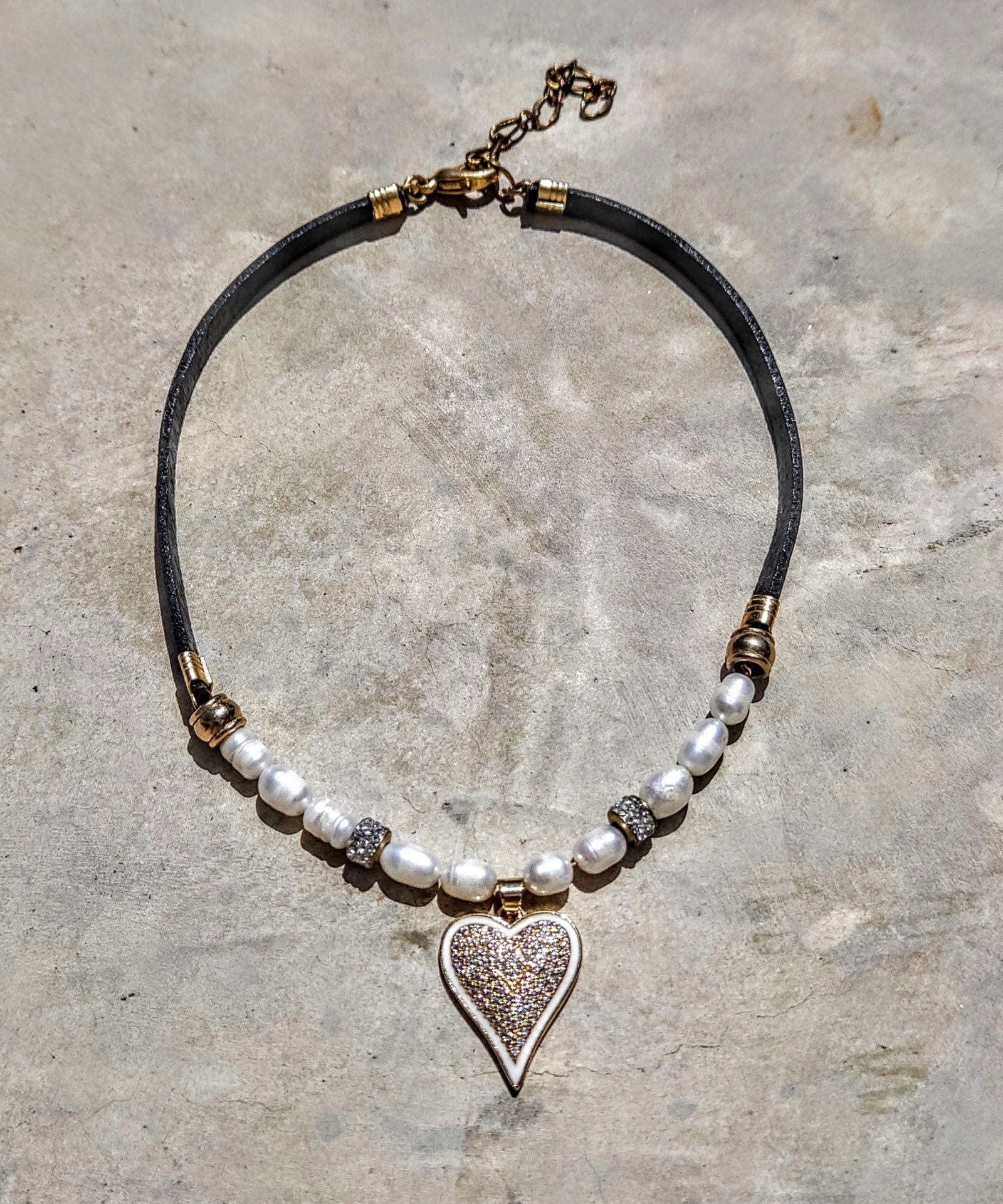 לב של רוקנ’רול. שרשרת מחומרים מנוגדים: עור שחור ופנינים טבעיות, עם תליון לב Pave’ נוצץ.