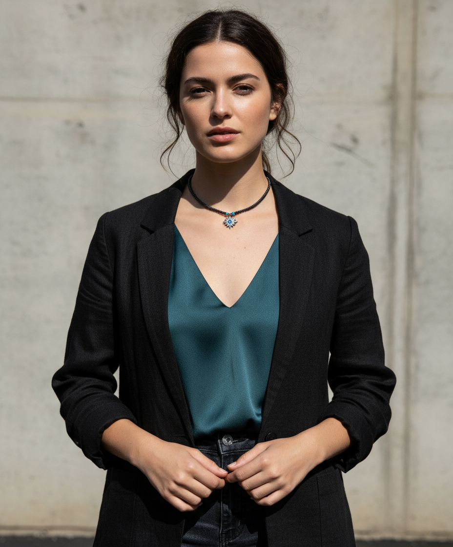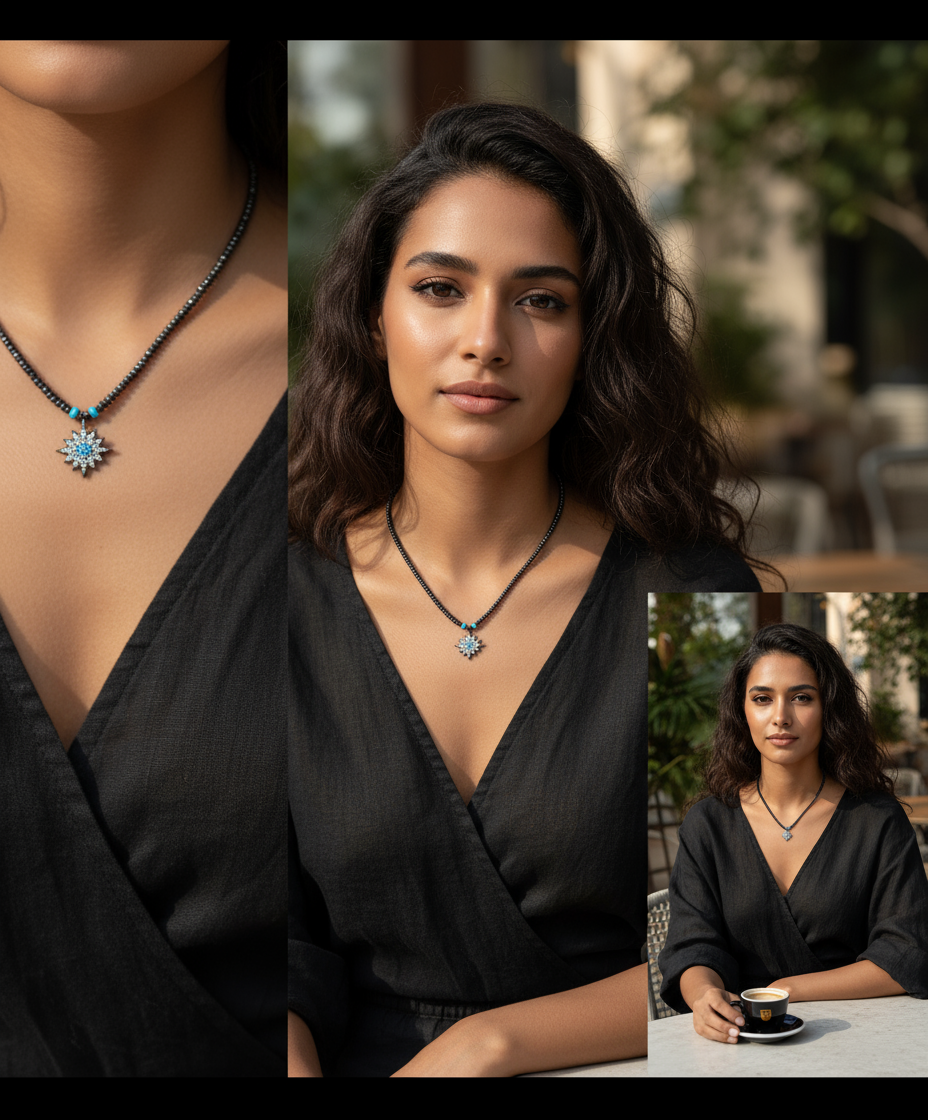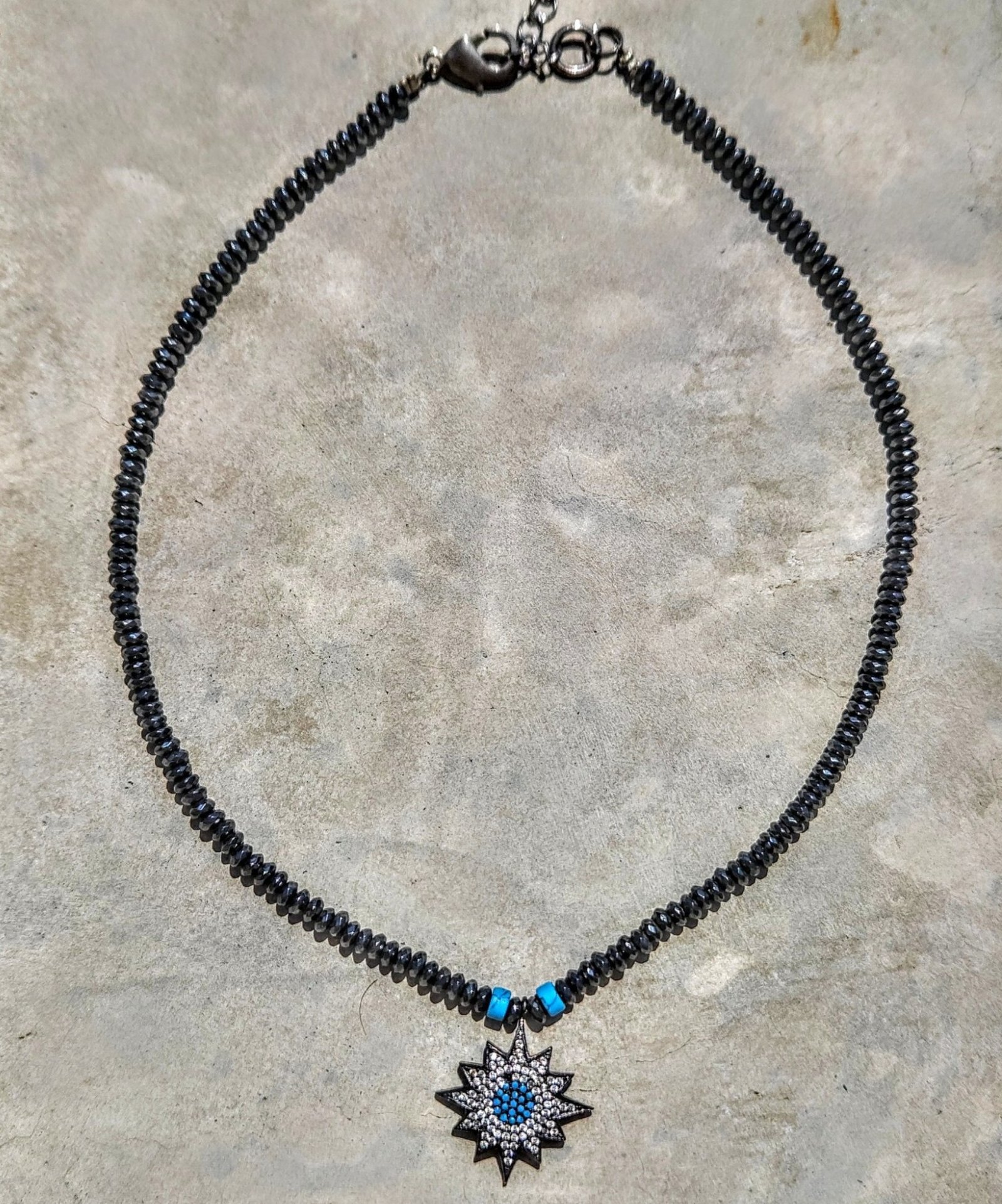 כוכב הצפון. קולר עדין של המטייט שחור נוצץ, עם תליון כוכב ארוך משובץ ונגיעת טורקיז.