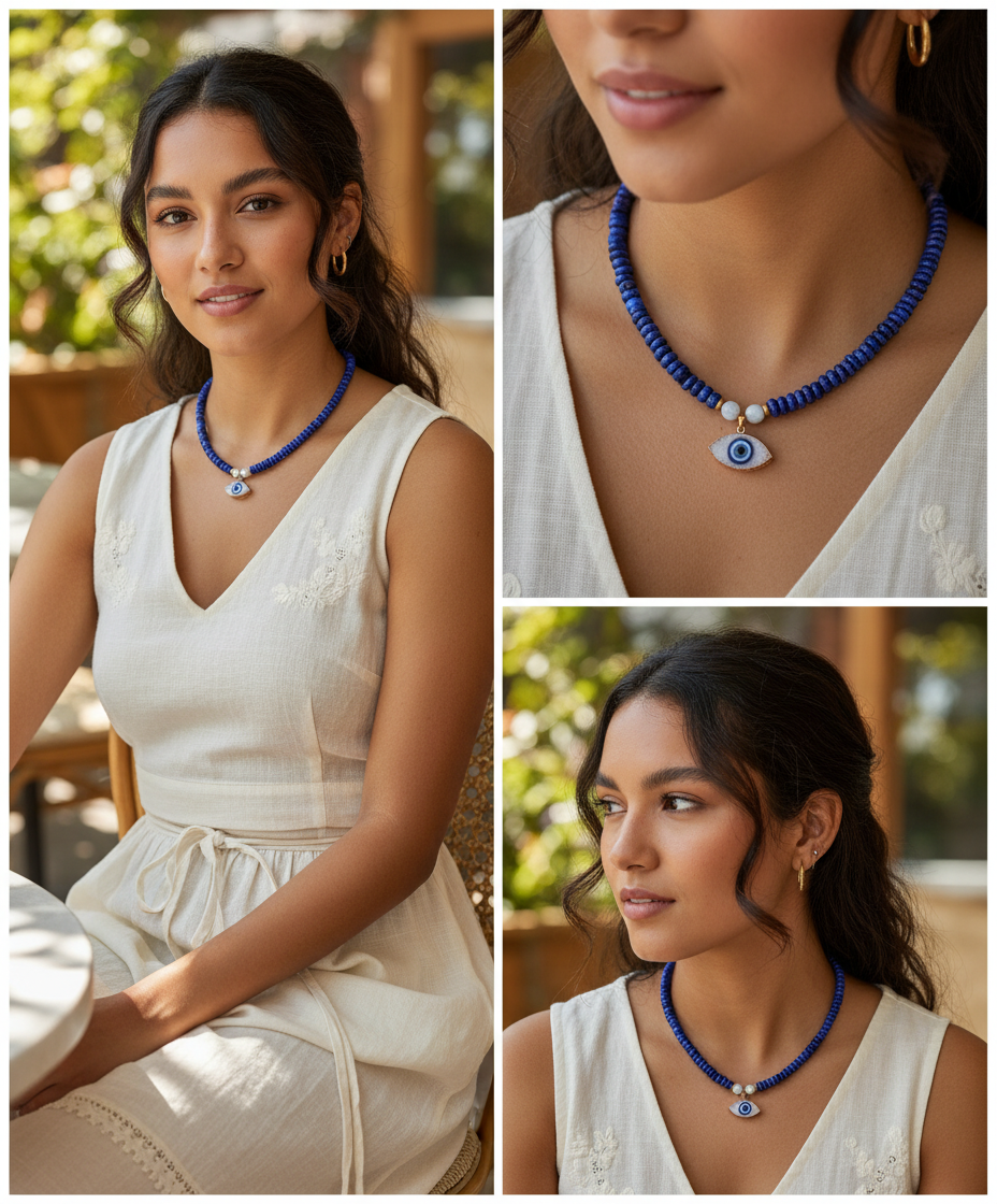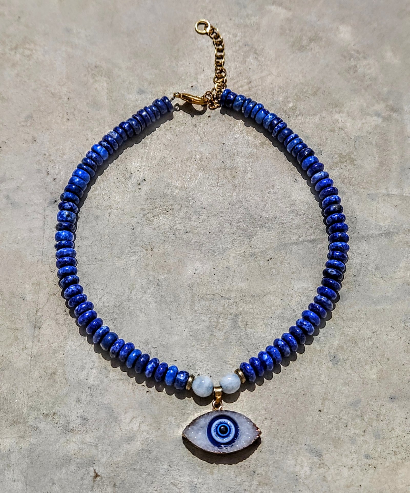 עין הדרקון הכחולה. קולר לאפיס לאזולי עמוק עם תליון עין רע בצורת אבן דרוזי מנצנצת ואבן ירח.