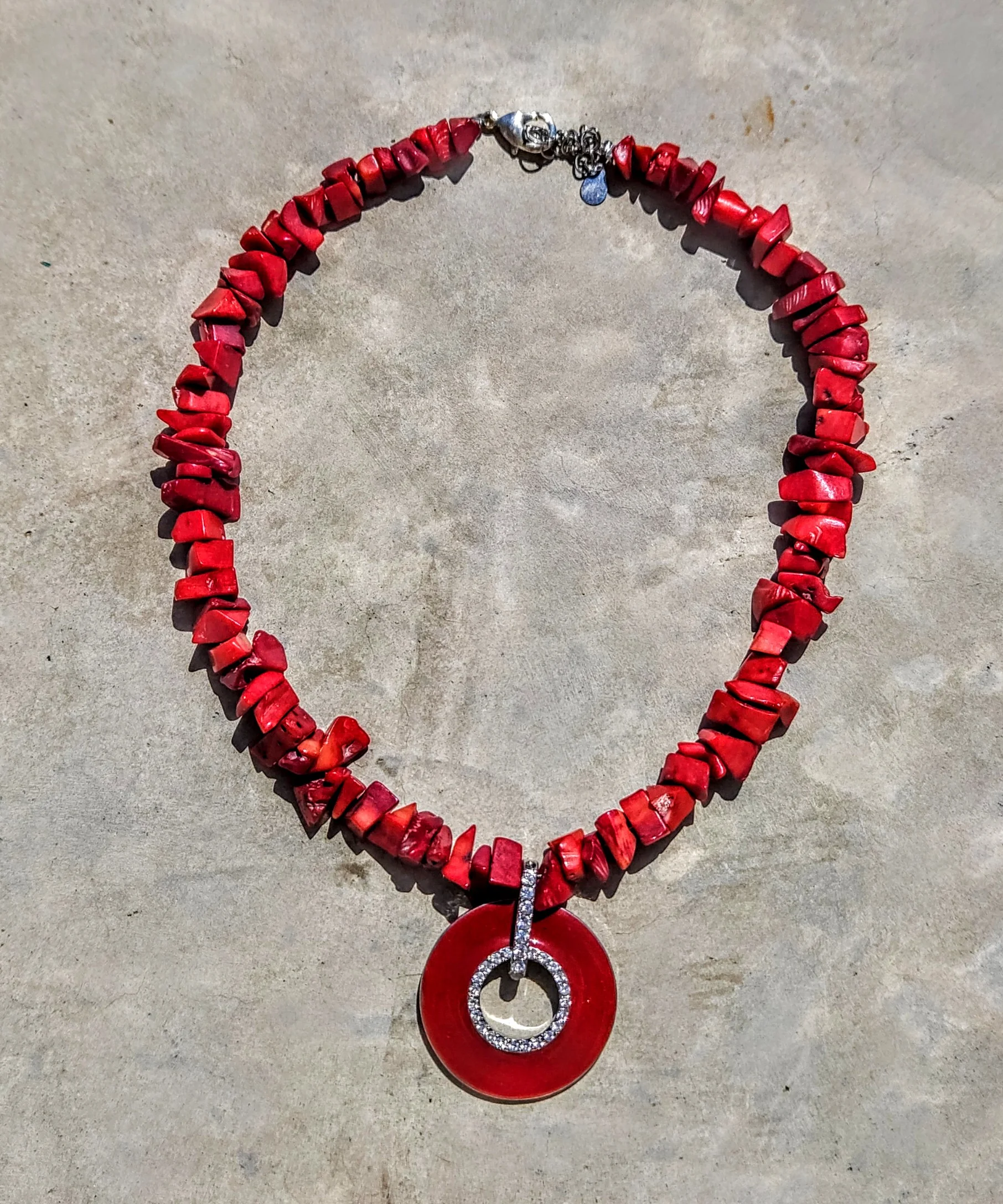 אש ותנועה. קולר קורל אדום בצורת שברים טבעיים עם תליון עיגול אדום משובץ – אנרגיה חסרת מעצורים.