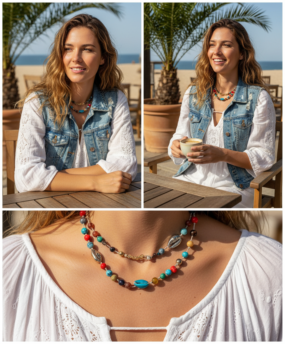 האלמוג הקטן. שרשרת אבנים צבעוניות רבות ופניני קאורי כסופות עם נגיעת טורקיז – חופש ואקלקטיות.